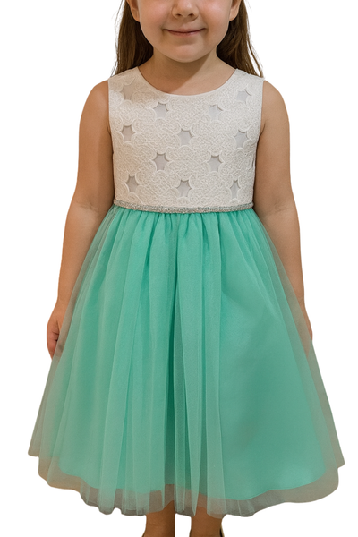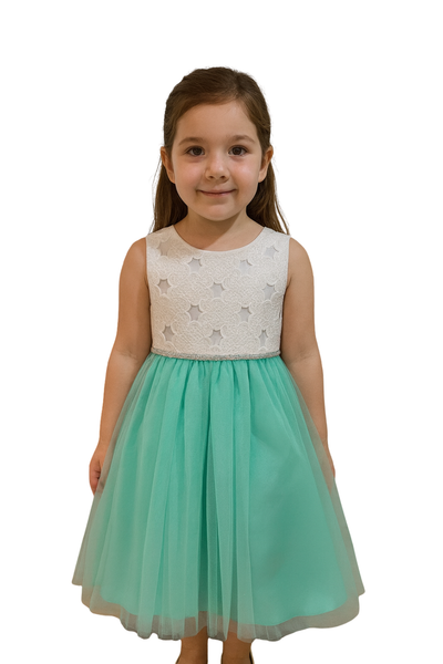 Vestido infantil en tono menta con un diseño fresco y encantador. La parte superior presenta un delicado bordado blanco con textura floral, mientras que la falda de tul aporta volumen y ligereza. La cintura con detalle de brillo sutil enmarca la silueta con un toque elegante. Perfecto para eventos de día, comuniones o fiestas, este vestido combina ternura, color y elegancia en una sola prenda.
