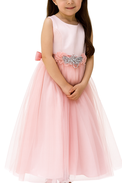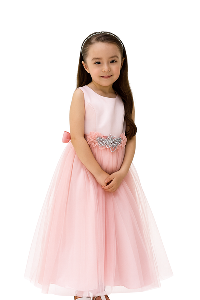 Vestido infantil en tono rosa pastel con un diseño delicado y encantador. La parte superior en satín aporta un acabado elegante, mientras que la falda de tul crea un volumen suave y ligero. Destaca el cinturón con aplicaciones de pedrería y flores en tono coral, que añade un toque tierno y sofisticado. Ideal para damitas, comuniones o eventos especiales, este vestido combina dulzura, elegancia y comodidad para las más pequeñas.