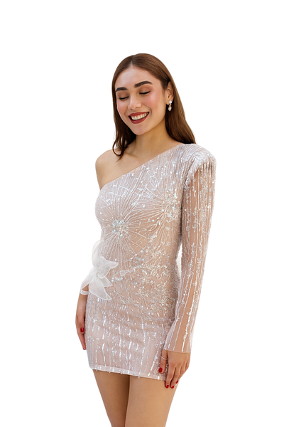 Un vestido corto y deslumbrante. El vestido es de un color claro con abundantes lentejuelas y detalles brillantes que crean un patrón radiante en toda la prenda. Tiene un diseño de un solo hombro, con una manga larga en el lado cubierto. Un detalle notable es la delicada flor de tela en la cintura que añade un toque romántico. Este vestido es ideal para eventos y fiestas, gracias a su estilo glamuroso y llamativo...