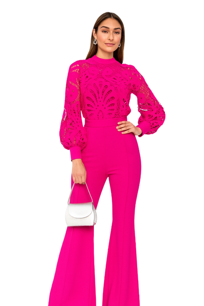 Palazzo color fucsia de encaje cuello alto y manga abullonada