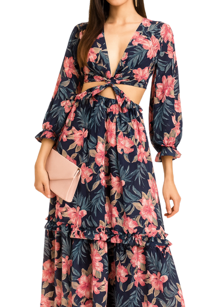 Vestido floreado con abertura en cintura, fresco de tela ligera.