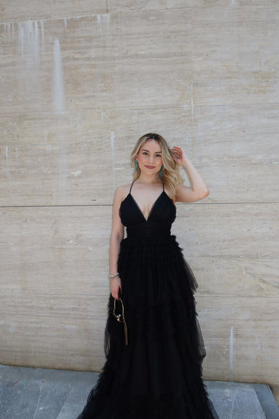 Color: Negro absoluto, que acentúa la elegancia y sobriedad del look.