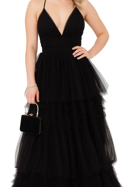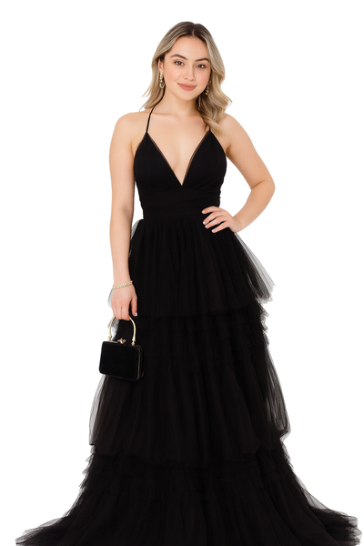 Escote: En "V" profundo con tirantes finos, resaltando el cuello y los hombros.