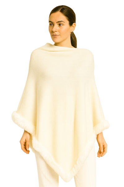 Poncho en tono marfil con ribete de peluche sintético que aporta un toque sofisticado y acogedor. Su textura suave y corte asimétrico crean una silueta fluida y femenina, ideal para eventos elegantes o looks invernales refinados.