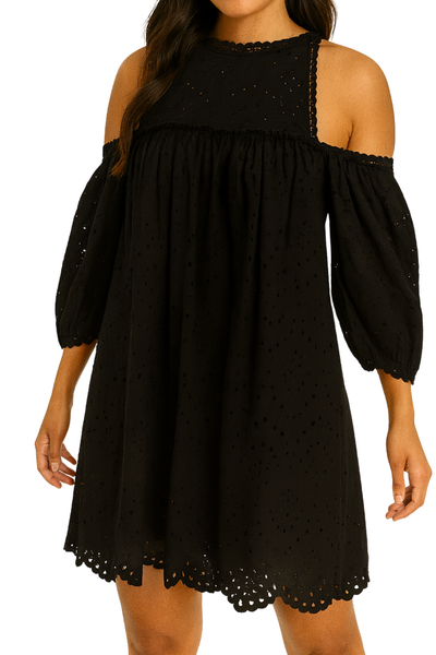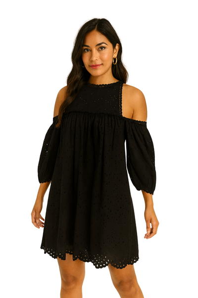 El Midnight Cutout Eyelet Dress es un vestido fresco, ligero y femenino, ideal para un look casual elegante. Su diseño off shoulder con cortes en los hombros aporta un toque moderno, mientras que las mangas abullonadas y el tejido bordado tipo eyelet añaden textura y delicadeza. El corte amplio brinda comodidad y movimiento, perfecto para usar durante el día o en salidas informales donde quieras lucir arreglada sin esfuerzo. El borde perforado del dobladillo completa el estilo con un acabado coqueto y sofisticado.
