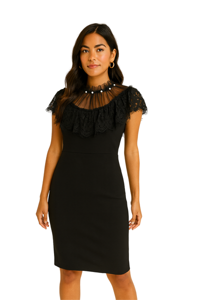El Midnight Grace Mesh Dress destaca por su elegancia moderna y su detalle superior único. El vestido combina un cuerpo liso de corte clásico con una pechera de mesh plisado adornado con delicadas aplicaciones tipo perla, creando un efecto sofisticado y llamativo. Las mangas y el borde superior incluyen encaje trabajado que aporta textura y un acabado refinado. Su silueta estilizada brinda un look elegante ideal para eventos formales, cenas especiales o cualquier ocasión donde quieras lucir impecable y distinguida.