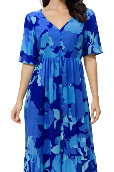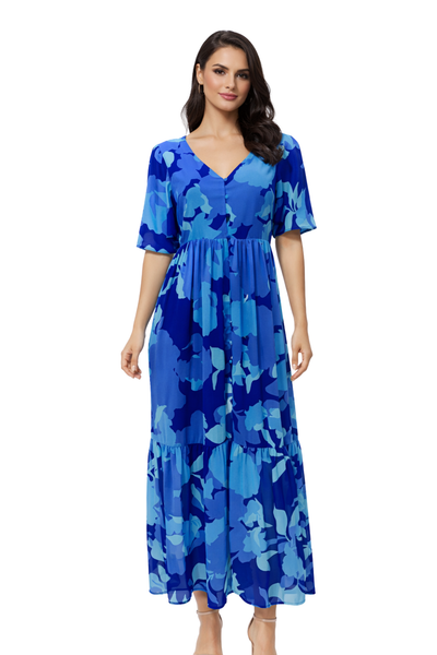 Un vestido fresco y femenino con un estampado floral en tonos azules que evoca elegancia y serenidad. Su corte fluido y cintura ajustada realzan la silueta con comodidad, mientras su caída ligera aporta movimiento y sofisticación. Perfecto para eventos de día, reuniones especiales o para lucir chic y natural en cualquier ocasión.