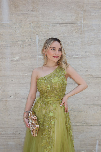 Escote: Asimétrico, de un solo hombro, lo que aporta un aire moderno y refinado.