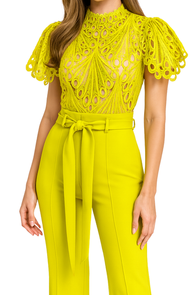 Palazo color lima para coctel con detalle de encaje en el dorso y listón para moño a la cintura.