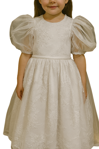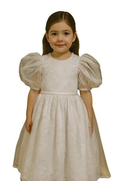 Vestido infantil en tono marfil con un diseño de ensueño y silueta clásica. Destacan sus mangas abullonadas de tul, que aportan volumen y un aire romántico. El tejido con bordado floral agrega textura y elegancia, mientras que la falda amplia genera un efecto de princesa ideal para ocasiones especiales. Perfecto para comuniones, cortejos o eventos formales, este vestido combina dulzura, estilo y sofisticación.