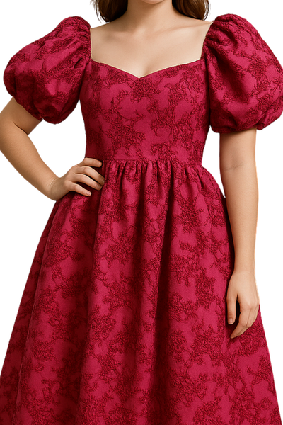 Vestido midi en tono rosa intenso con textura floral en relieve que aporta elegancia y feminidad. Su escote en forma de corazón y mangas abullonadas crean un equilibrio entre lo romántico y lo moderno, mientras que la falda con volumen sutil añade movimiento y frescura. Confeccionado en tela estructurada que mantiene su forma, es ideal para eventos de día, cocteles o celebraciones especiales. Un diseño sofisticado y encantador que destaca por su estilo clásico renovado.