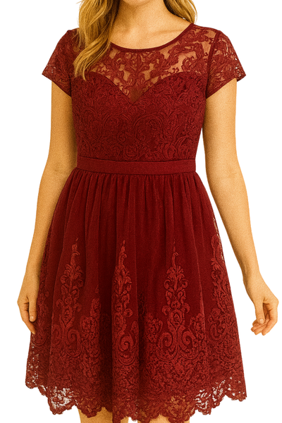 El Ruby Elegance Lace Dress combina el encanto del encaje con una silueta clásica y femenina. Su parte superior presenta un delicado encaje con transparencias sutiles que aportan un toque sofisticado, mientras que la falda de tul bordado añade volumen ligero y movimiento elegante. El tono rubí hace que este vestido sea ideal para eventos formales, cenas especiales o celebraciones donde quieras destacar con un look refinado, romántico y atemporal.