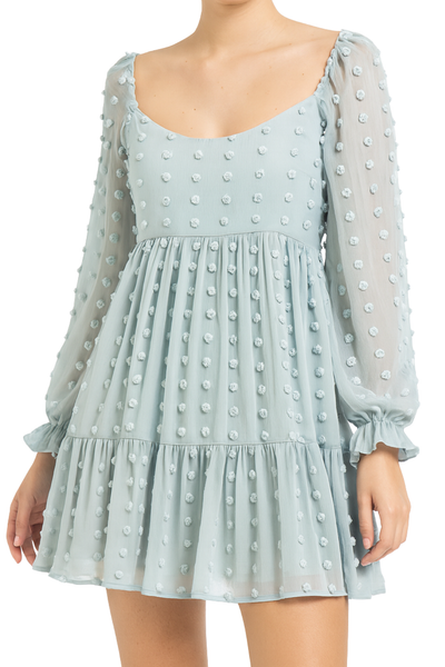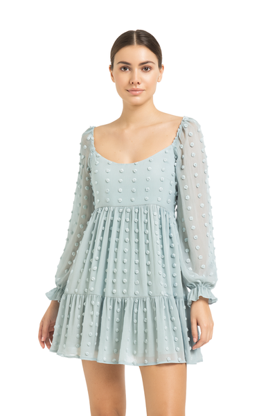 El Sky Blue Swiss Dot Chiffon Dress es un vestido corto y delicado confeccionado en gasa con textura swiss dot, que aporta relieve y un toque romántico. Su escote amplio y mangas largas semitransparentes crean una silueta suave y femenina, mientras que su falda con vuelos añade movimiento y ligereza. Ideal para eventos de día, reuniones especiales o looks frescos y elegantes.